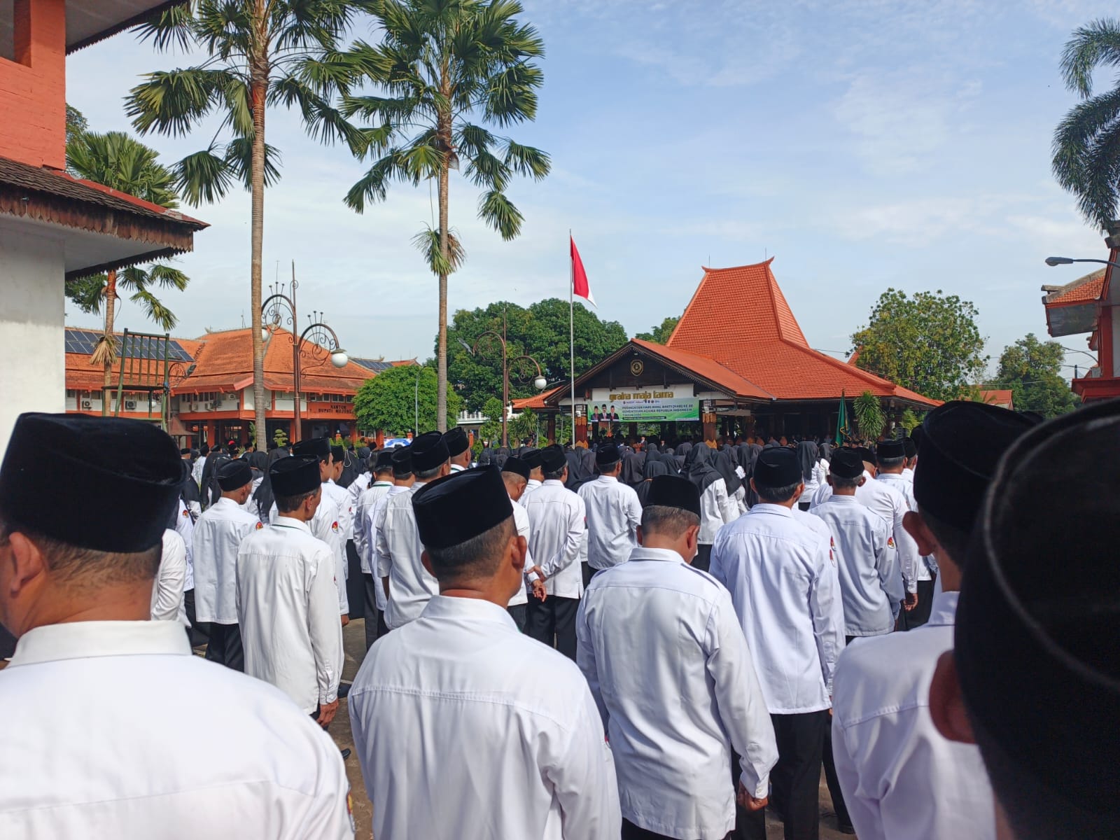 Berdasarkan pantauan di lokasi, seluruh ASN Kemenag Kabupaten Mojokerto tampil kompak dengan mengenakan seragam putih dan kopiah hitam. Mereka berbaris rapi di lapangan upacara dengan latar belakang bangunan Graha Majatama yang ikonik,. Kehadiran para ASN ini mencerminkan soliditas organisasi di bawah kepemimpinan Bapak Muttakin, M.Ag., dalam menjalankan tugas-tugas pembangunan di bidang agama di wilayah Mojokerto.